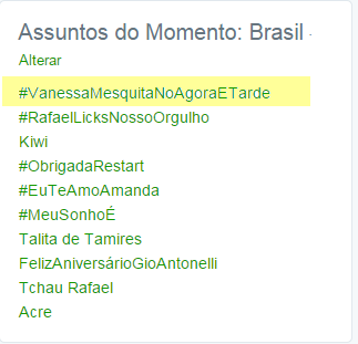 @rafinhabastos Migo, atualiza, está em primeiro#VanessaMesquitaNoAgoraETardeThanks. Twitter will use this to make your timeline better. UndoUndo