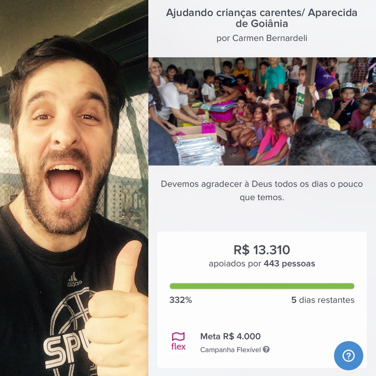 o mais lindo é que a media doada por pessoa fica em R$30. Olha oq a gente pode fazer com tão pouco.