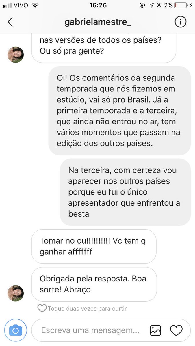 caralho o @rafinhabastos acabou de me responder no direct do insta ok talvez nao seja ele seja um assessor mas fodasseeeee