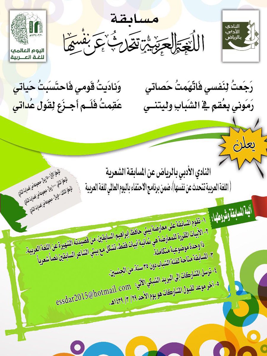 #أدبي_الرياض_يحتفي_باللغة_العربية#مسابقة_العربية_تتحدث_عن_نفسها ترسل المشاركات إلى essdar2015@hotmail.com التفاصيل هنا