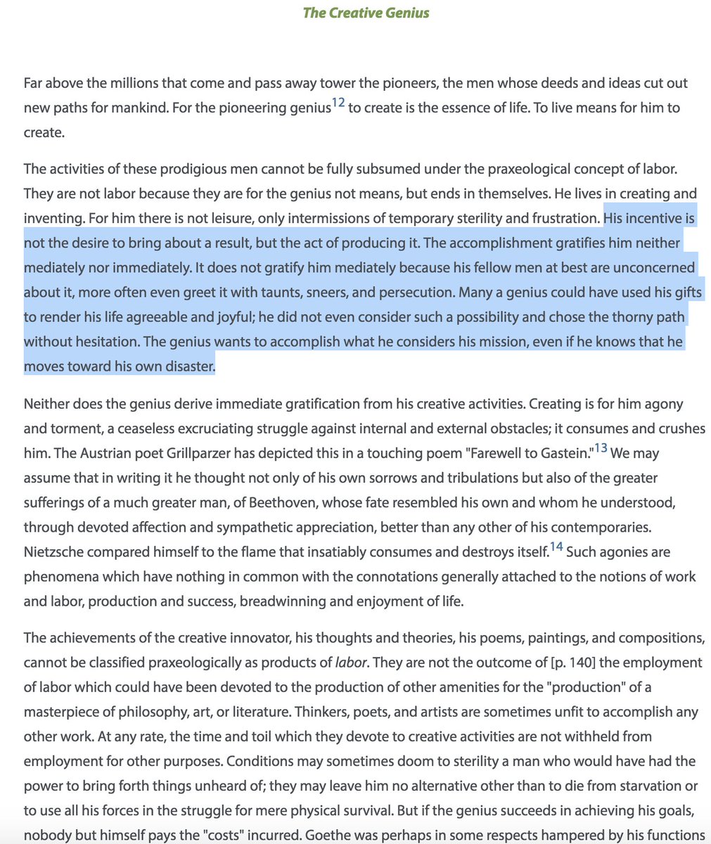 Ludwig von Mises on 'the creative genius' "He lives in creating and inventing. For him there is not leisure, only intermissions of temporary sterility and frustration. His incentive is not the desire to bring about a result, but the act of producing it."https://twitter.com/TraceMayer/status/1019203277517459457 …