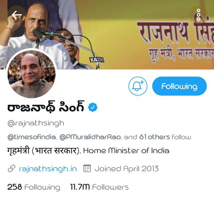 Great pleasure to see Hon’ble Union Home Minister Mananiya Shri @rajnathsingh ji’s Twitter handle depict in Telugu, on the eve of his visit to Hyd, Telangana to address the inaugural session of @BJYM ‘s National Convention - “Vijay Lakshya 2019" ధన్యవాదాలు 🙏 స్వాగతం సుస్వాగతం🙏 pic.twitter.com/XhIxfYoX0E