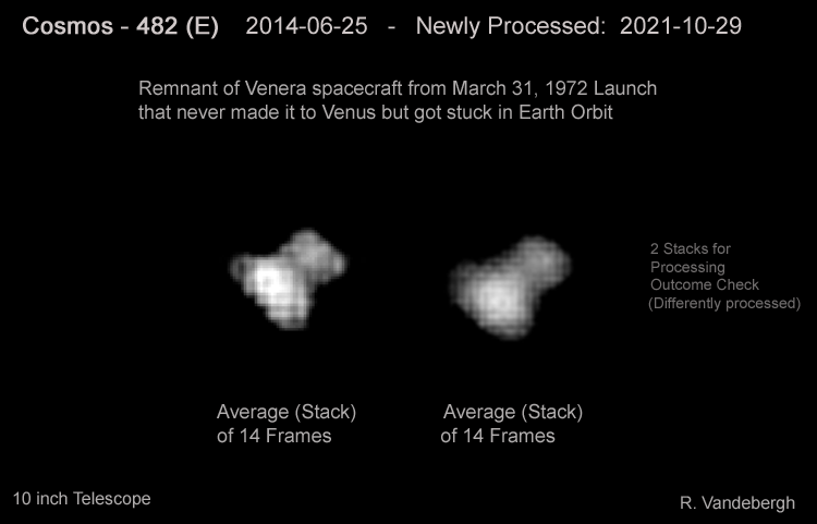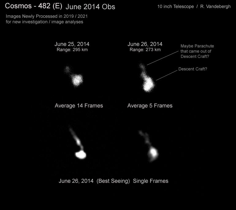 1972 Venera spacecraft Cosmos-482, piece-E, set of reprocessings of 2014 obs in order to do a new investigation. It's hypothetical but it could be that the undeployed parachute came out of the capsule and we see this as the elongated element attached to the compact bright object!pic.twitter.com/mctgLyfzx0