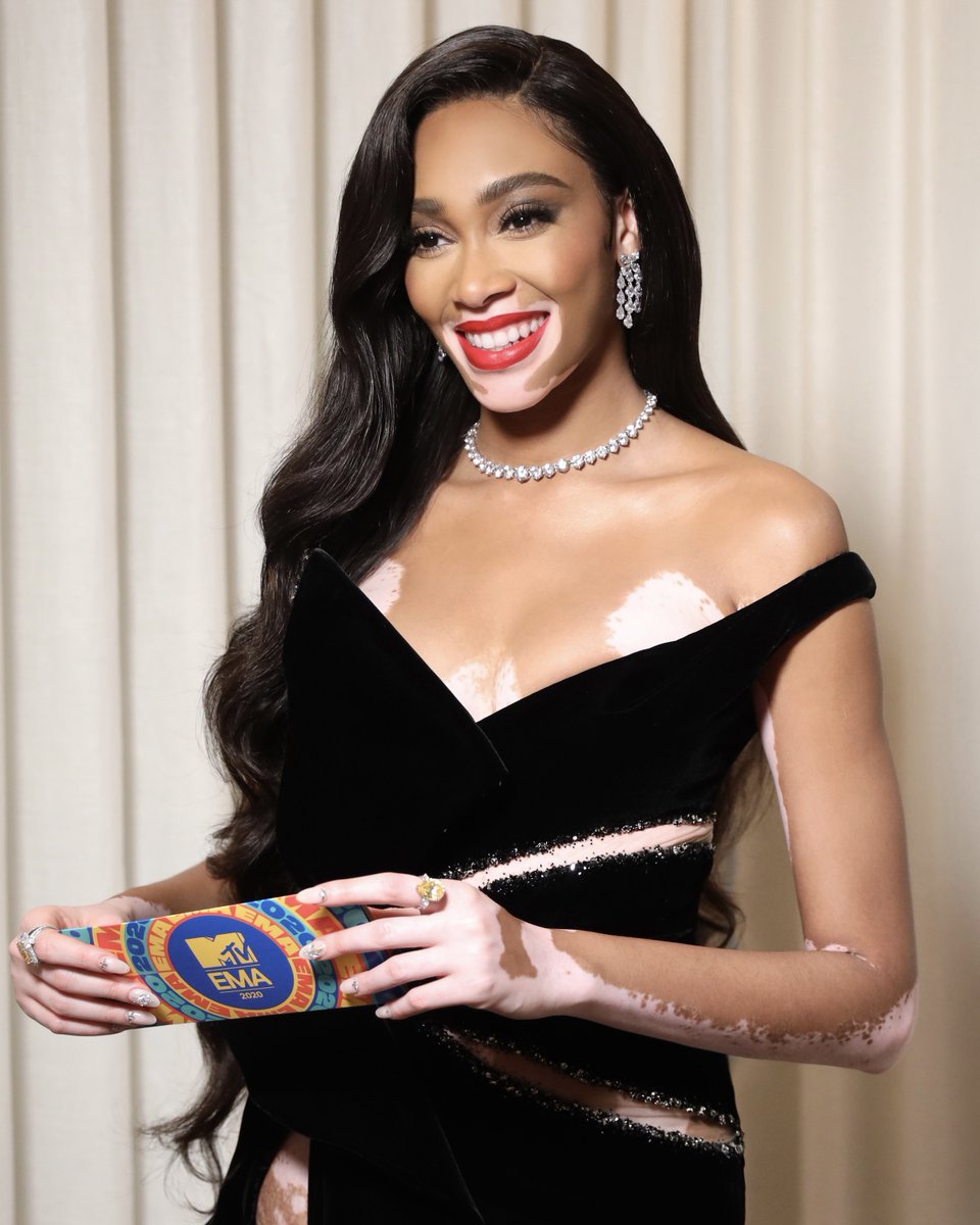 #WinnieHarlow brings back red carpet glamour in a#black velvet#couture gown by#RalphandRusso as the supermodel took on the role of virtual award presenter for this year's#MTVEMA Awards.#RandRCouturepic.twitter.com/HXqEj5pwI5