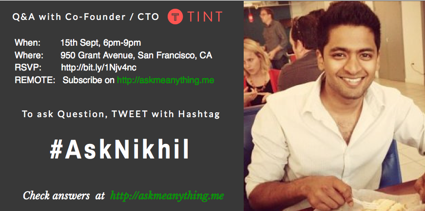 @Aitharaju of@tint RSVP: http://bit.ly/1Njv4nc , REMOTE => http://bit.ly/1K9I3Ta pic.twitter.com/uKni60oH6P