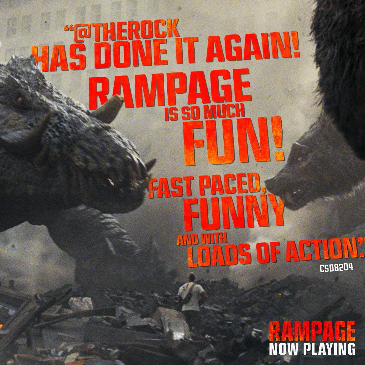 @TheRock has done it again! Rampage is so much fun! Fast paced, funny, and with loads of action.” Now playing in theaters, get your tickets today! http://www.fandango.com/rampagemovie pic.twitter.com/HUl3F9iVqZ