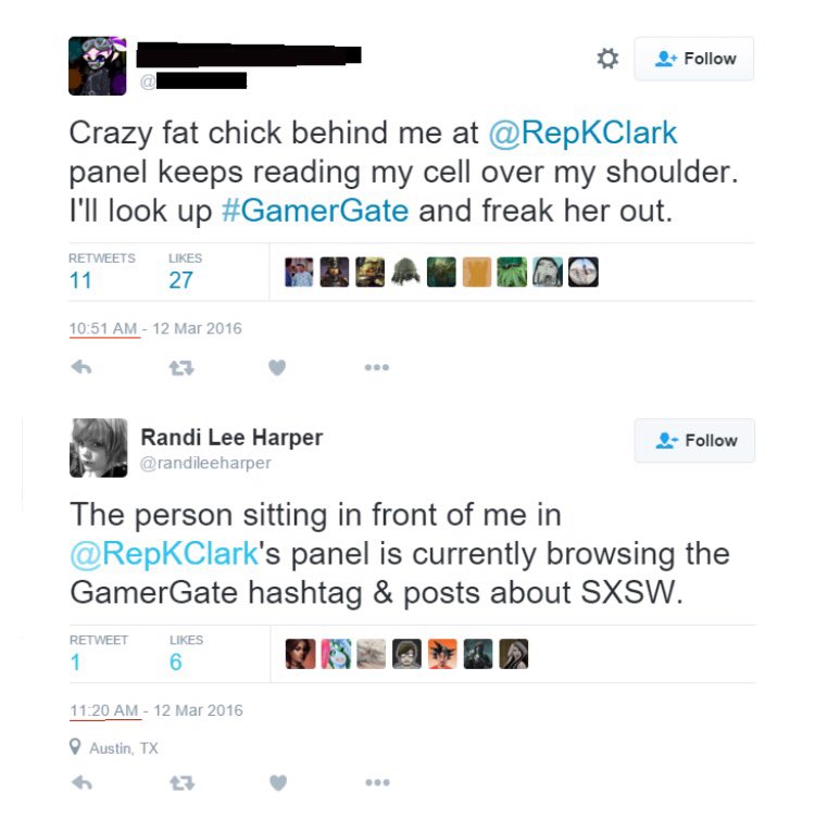 The person sitting in front of me in @RepKClark's panel is currently browsing the GamerGate hashtag & posts about SXSW.
