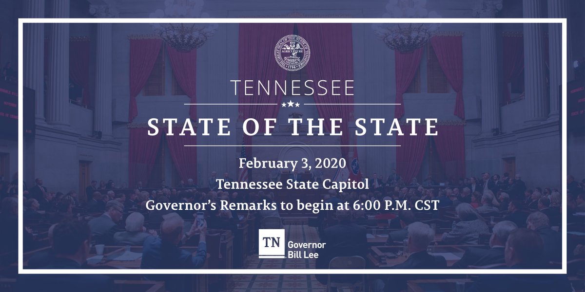 #TNSOTS to update Tennesseans on what we've accomplished this past year and present my vision for the future of this great state. https://www.tn.gov/governor/news/2020/1/27/governor-lee-to-deliver-second-state-of-the-state-address-on-february-3.html …pic.twitter.com/nNYdMSBmDA