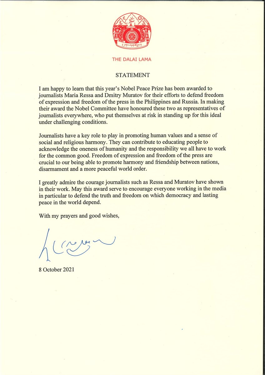 READ: The Dalai Lama congratulates Rappler's @mariaressa and Russian journalist Dmitry Muratov on their Nobel Peace Prize win. The Dalai Lama highlights the key role journalists play in "promoting human values and a sense of social and religious harmony."pic.twitter.com/tpDzUbyN0p