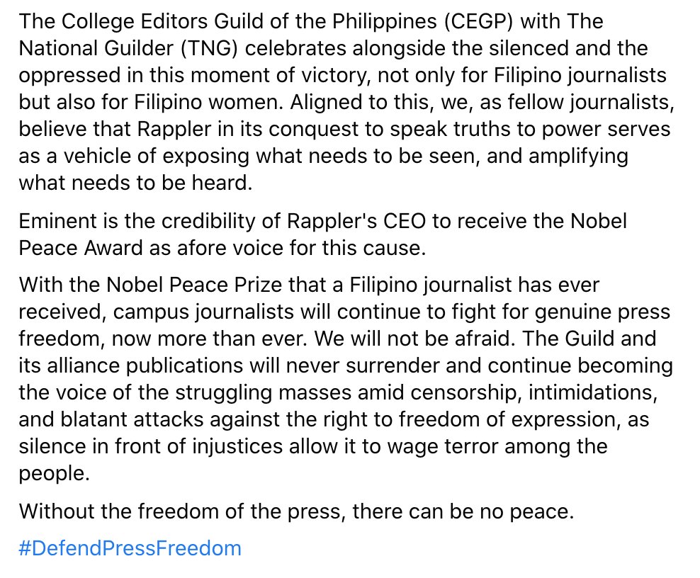 READ: @CEGPhils celebrates Rappler's @mariaressa's Nobel win, says the Prize "serves as a wake-up call for Filipinos to remain stalwart and unyielding in the face of oppression."