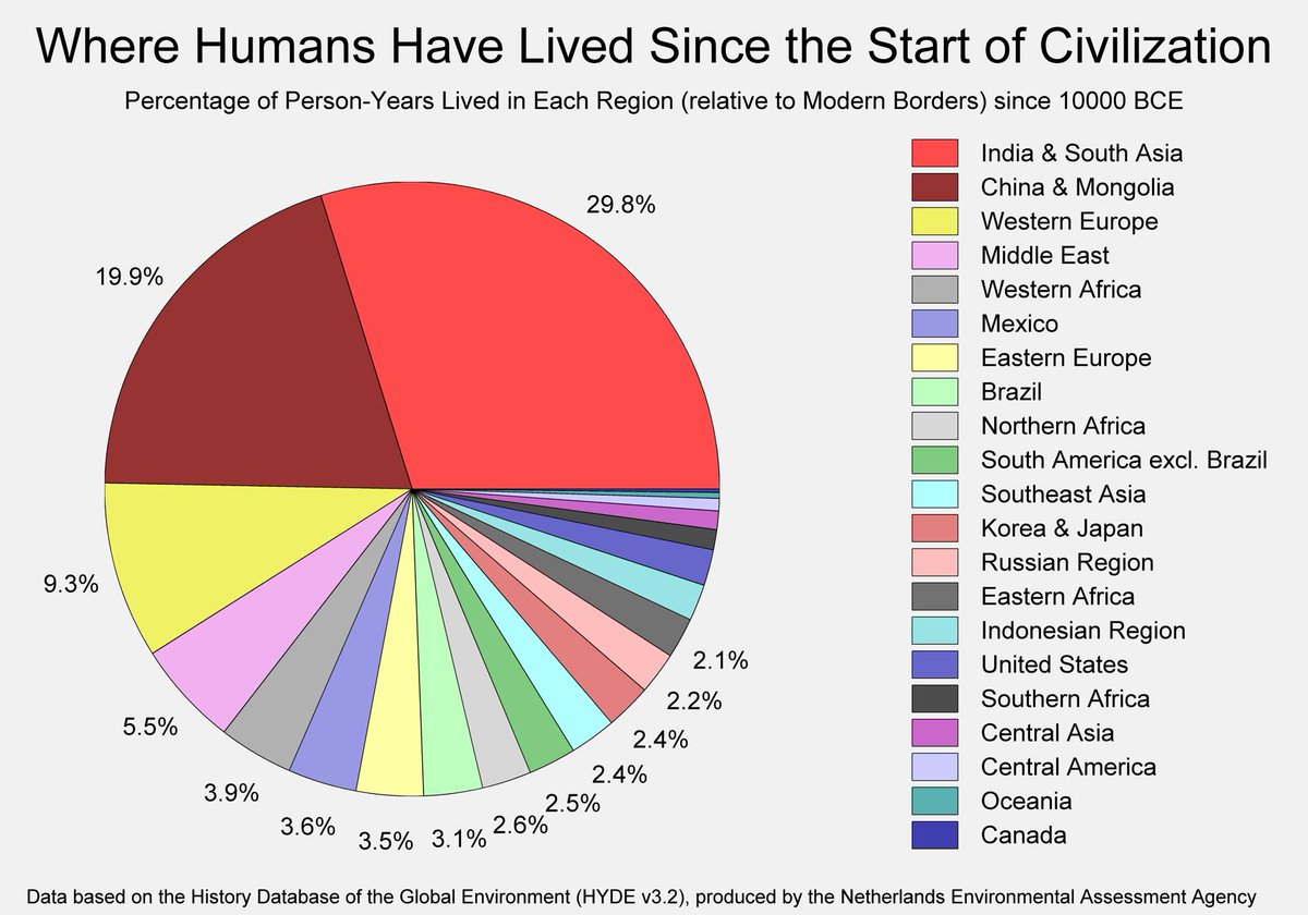 What if we divided the regional study of history based on how many people have lived in each place since the start of civilization? Roughly 30% would go to India & South Asia, 20% to China, 9% to Western Europe, 5.5% to the Middle East, 3.5% to Mexico, and <2% to the USA.pic.twitter.com/lLRT7E2lsi