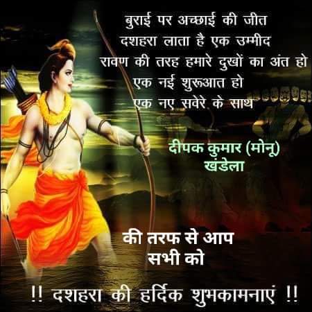 बुराई पर विजय का एवं अहंकार के अंत का प्रतीक दशहरा के पावन पर्व की आप सभी को हार्दिक बधाई एवंशुभकामनाएं !!! आने वाला समय भी हम सब के हाथ में हैं देश में रावण राज को खत्म करके राम राज फिर से स्थापित हो यही संकल्प होना चाहिए!!! 🇮🇳दीपक कुमार (मोनू) खंडेला🇮🇳pic.twitter.com/hglHCljil3