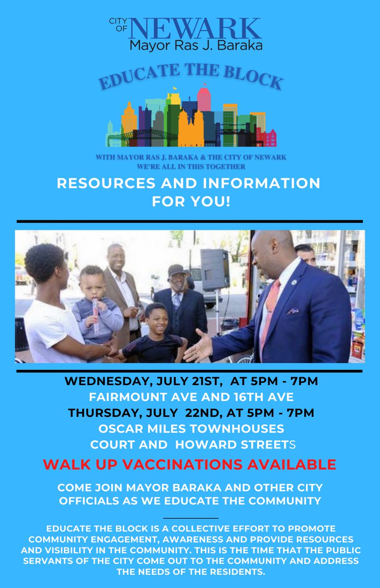 This week Educate the Block is back! Meet us at these locations to get vaccinated, and connected to valuable information & resources that can help improve your life: Wednesday (7/28) - So. Orange Ave & 9th St Thursday (7/29) - Isabella Ave & So. Orange Avepic.twitter.com/Fb7CJi1Iz9