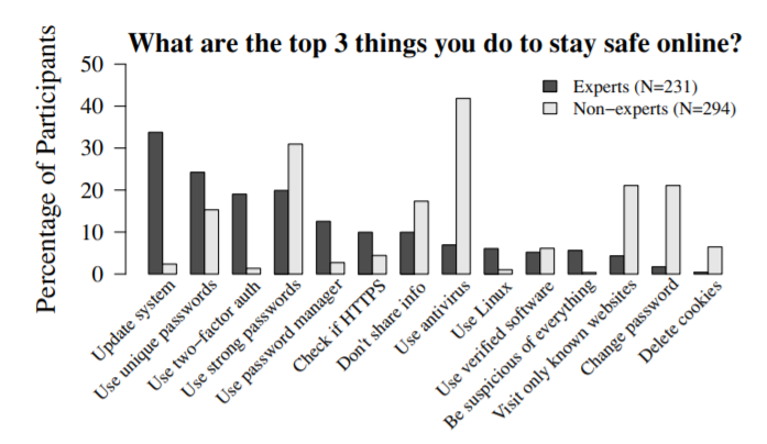 Here's an excellent study that compares the security practices of experts and non-experts. The most important things you can do to stay safe online are to promptly apply software updates, avoid password reuse, and enable two-factor authentication. https://www.usenix.org/system/files/conference/soups2015/soups15-paper-ion.pdf …pic.twitter.com/x9NxVU9cAs