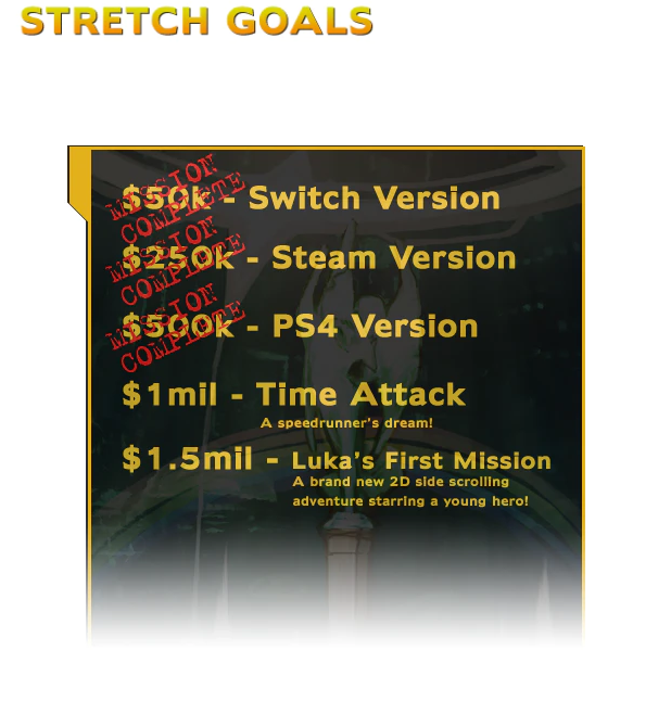 Updated stretch goals for The Wonderful 101: Remastered include Time Attack at $1 million and Luka's First Mission at $1.5 mil (brand new 2D side scrolling adventure)pic.twitter.com/LcIkF49Rpq