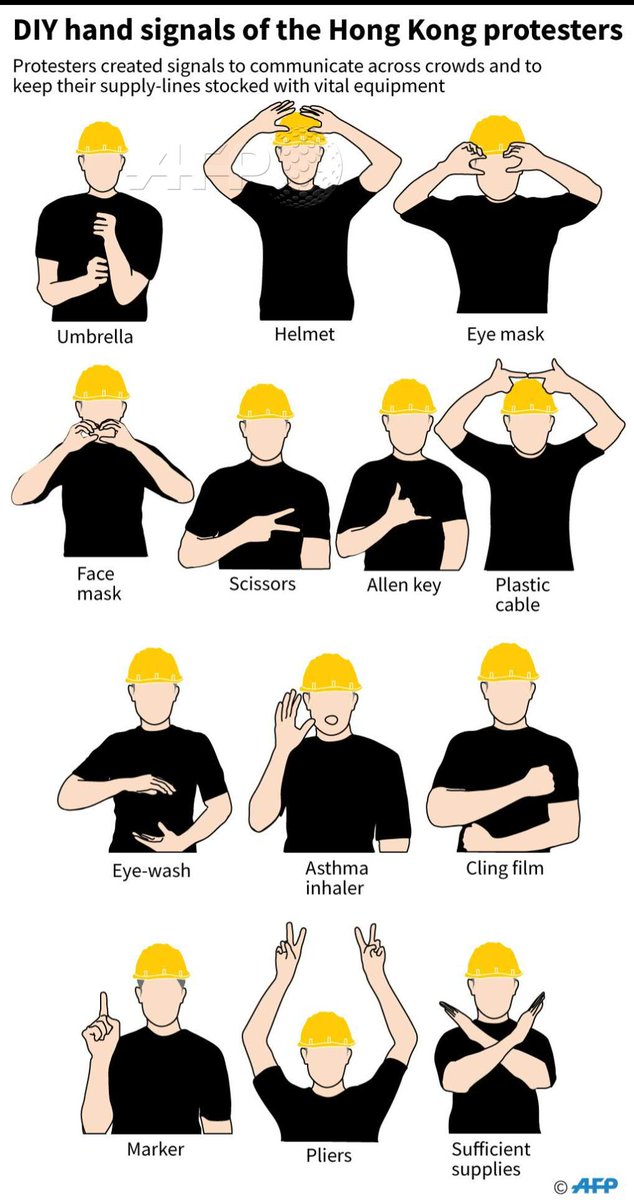 In an inventive move that proved key in supporting those on the front lines, the Hong Kong protesters created a string of hand signals to communicate equipment requestshttp://u.afp.com/Jsjm