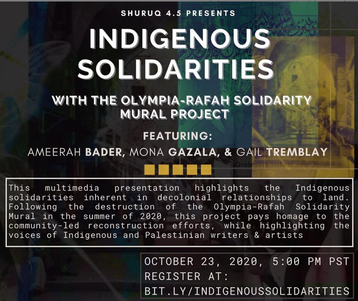 Tonight at 5 PM PST! Join Ameerah Bader, Mona Gazala, & Gail Tremblay for a multimedia presentation highlighting Indigenous solidarities inherent in decolonial relationships to land. Co-sponsored by