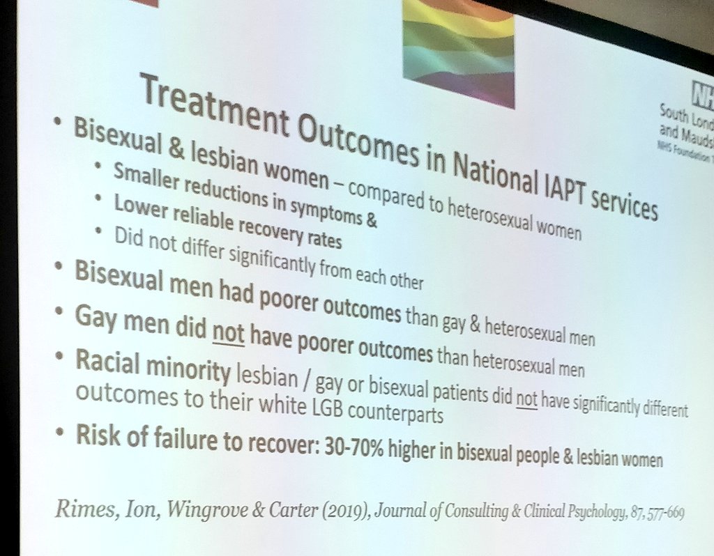 interesting findings in IAPT treatment outcomes. bisexual and lesbian women had poorer outcomes, as did bisexual men, but not gay men. racial minority LGB patients didn't have significantly different outcomes to white counterparts. #RCPsychICpic.twitter.com/8fOBtvH3Ce