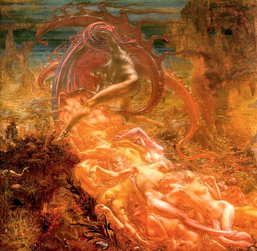 "The Treasures of Satan" by Jean Deville (1867-1953). The depiction of Satan under water was a first in Western Art. Instead of wings he has long octopus tentacles. His 'treasures' are the sleeping figures surrounded with jewels & gold coins; representing materialism & avarice. pic.twitter.com/jO0dNs0Rh2