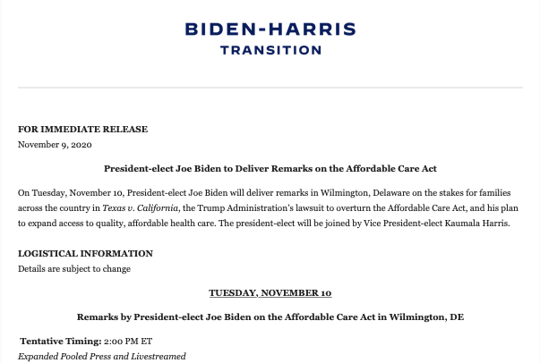 On Tuesday, @JoeBiden will deliver remarks in Wilmington, Delaware "on the stakes for families across the country in Texas v. California, the Trump Administration’s lawsuit to overturn the Affordable Care Act, and his plan to expand access to quality, affordable health care."