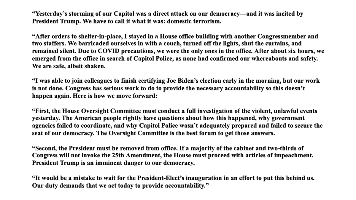 It would be a mistake to wait for the President-Elect’s inauguration in an effort to put this behind us. Our duty demands that we act today to provide accountability. Read my full statement on what happened at the Capitol yesterday: pic.twitter.com/vx0GAf6KId
