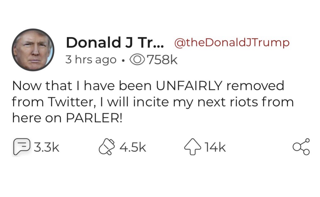This unverified Donald Trump account posts “I will incite my next riots from here on PARLER!” It has 14k upvotes. pic.twitter.com/wz0eQ9QwSv