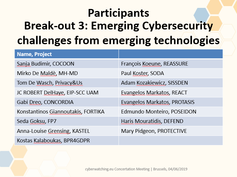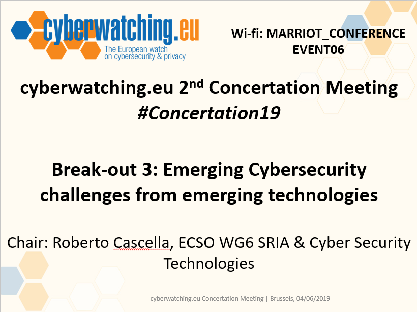 #Concertation19@cyberwatchingeu Break-out Session: Roberto Cascella@r_cascella from@ecso_eu chairs the session on Emerging#Cybersecurity challenges from emerging technologies. How can we prepare? Projects involved present their ideas and solutions#IoT#AIpic.twitter.com/cvg1mRqHbK