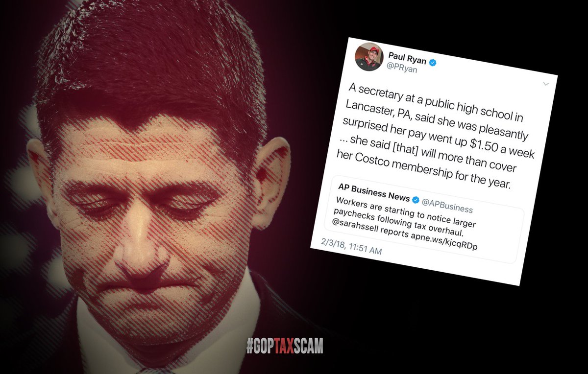 Today marks the 6 month anniversary to when Paul Ryan grossly bragged about a secretary’s $1.50 pay raise while failing to mention he got $500,000.00 from the Koch family for passing the #GOPTaxScam that’s benefiting the rich. #FlashbackFriday pic.twitter.com/QrG8EE8XEw