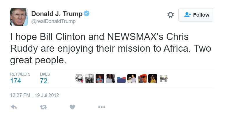 @realDonaldTrump we love it when Mr Clinton visits our shores.
