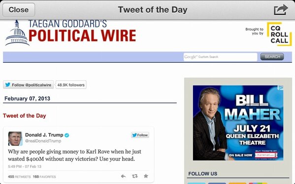 @realDonaldTrump's link 2@politicalwire's "Tweet of the Day" is the larger@billmaher adpic.twitter.com/zE1pNHRl