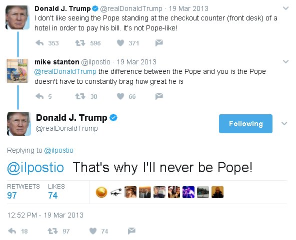 @realDonaldTrump@ilpostio If you were Pope, you'd be awesome.Thanks. Twitter will use this to make your timeline better. Undo -