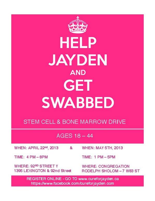 @realDonaldTrump@CureForJayden Thank you Mr.Trump for spreading the word about the Bone Marrow Drive April 22, at the 92nd street Y 4-8pm! - 1 more reply