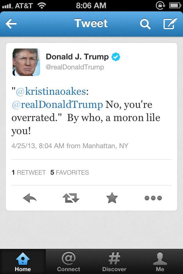 *like RT@realDonaldTrump: "@kristinaoakes: @realDonaldTrump No, you're overrated." By who, a moron lile you!”