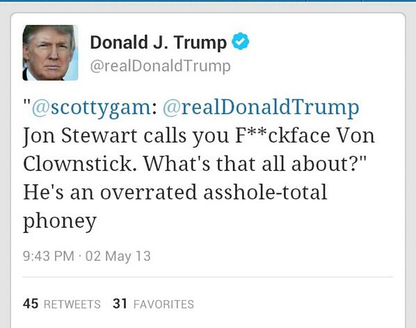 @realDonaldTrump Says Jon Stewart is "an overrated asshole" & "total phoney" -- Oh my.#HistoricIrony!pic.twitter.com/rmZw2P7iaV
