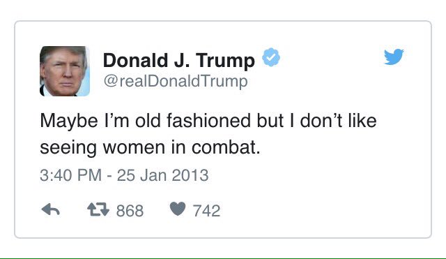 @realDonaldTrump So women shouldn't serve? Progressive, Donald.Thanks. Twitter will use this to make your timeline better. Undo -