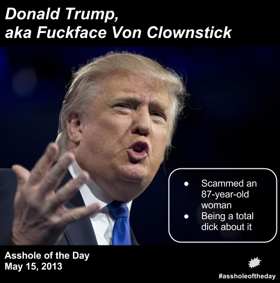 @realDonaldTrump #Trump scammed an 87-year-old #woman..is now being a dick about it http://assholeoftheday.us/post/50521296272/asshole-of-the-day-for-may-15-2013-donald-trump … … … pic.twitter.com/qECyoBjh7b U Know