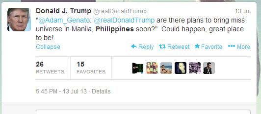 “@IamOliSara "@realDonaldTrump are there plans to bring miss universe in Manila, Philippines soon?" Could happen, great place to be!”