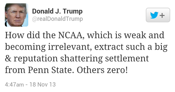 @realDonaldTrump: How did NCAA which is becoming irrelevant get such a reputation shattering settlement from Penn State. Others 0." -