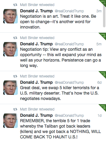 “@realDonaldTrump: Negotiation is an art. Treat it like one. Be open to change-it's another word for innovation.”Art of the deal - think big