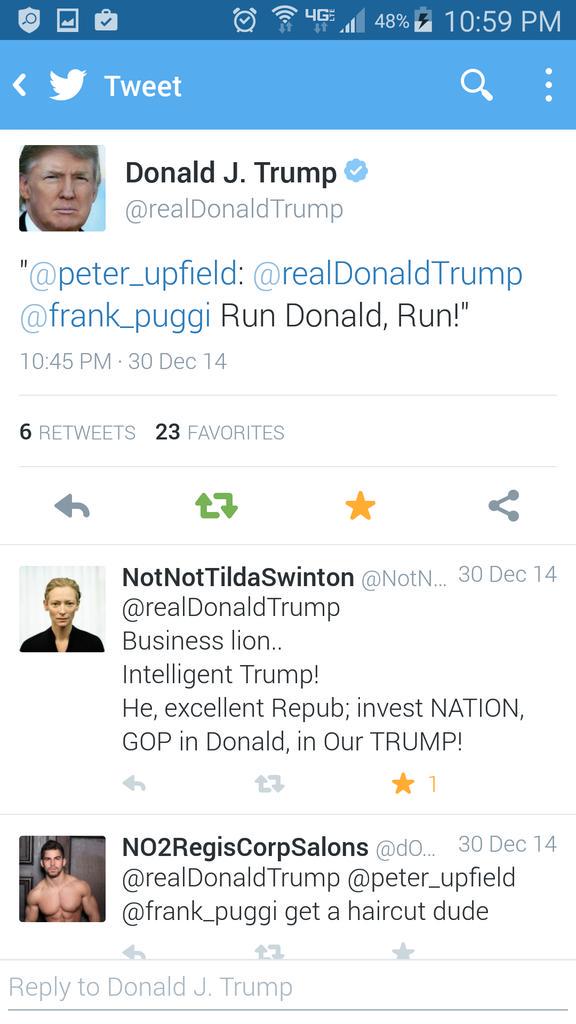 @realDonaldTrump: "@peter_upfield:@realDonaldTrump@frank_puggi Run Donald, Run!"”/ Away!Thanks. Twitter will use this to make your timeline better. Undo -