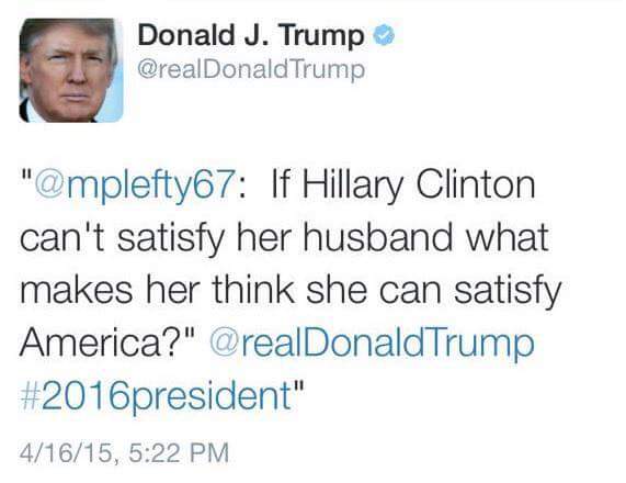 @realDonaldTrump @Antonio_Annesi Damn fools. Trump don't actually answer his tweets.He has staffers answering them.http://www.dailymail.co.uk/news/article-3043861/Claim-Hillary-Clinton-t-satisfy-husband-winds-Donald-Trump-s-Twitter-account-staffer-retweets-it.html …