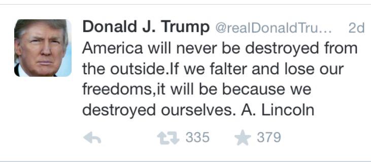 @realDonaldTrump RT suggest you have no hope of winning a general election highest quote past 2 days Abraham Lincolnpic.twitter.com/LqJ9J4al4HThis media may contain sensitive material. Learn more