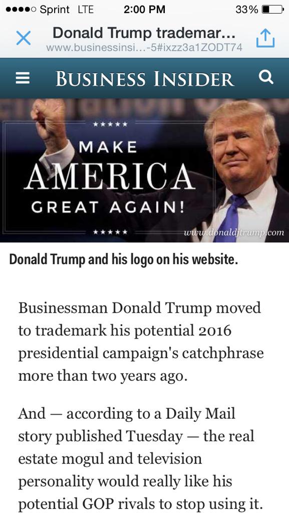 @realDonaldTrump@businessinsider How do you trademark someone else's slogan? Isn't that IP theft? Make up your own slogan!Thanks. Twitter will use this to make your timeline better. Undo -