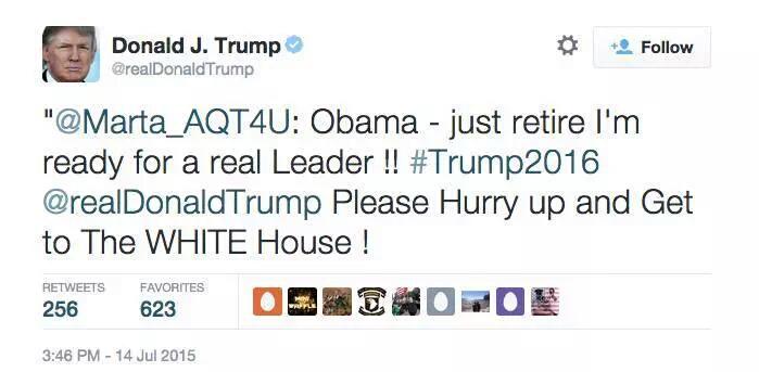 #POTUS is a real leader.@realDonaldTrump is a real douchehydrant, and a racist.@Marta_AQT4U is a real racist, too.#FeelTheBernThanks. Twitter will use this to make your timeline better. Undo -