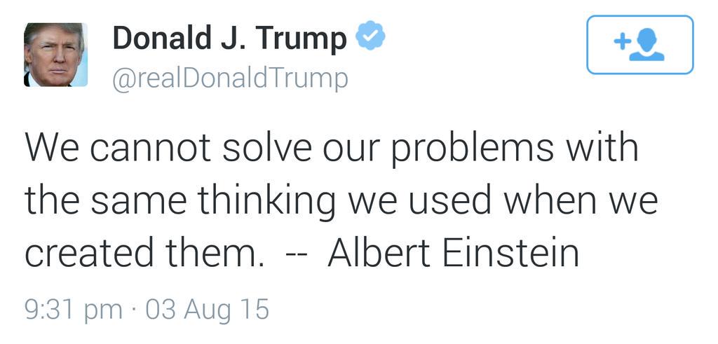 “@realDonaldTrump: We cannot solve our problems with the same thinking we used when we created them. -- Albert Einstein”Thanks. Twitter will use this to make your timeline better. Undo -
