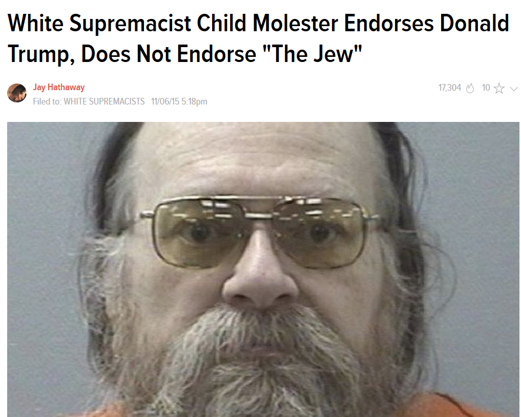 @realDonaldTrump@jmartNYT http://gawker.com/white-supremacist-child-molester-endorses-donald-trump-1741083340?utm_campaign=socialflow_gawker_twitter&utm_source=gawker_twitter&utm_medium=socialflow … This is what you promote racist bigot this is another endorsementpic.twitter.com/LHBeBMSX1I