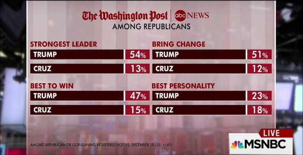 @realDonaldTrump Latest Poll: Donald Trump#smashes Ted Cruz in head to head 'Match Up' 54% For Trump, 13% for Cruz!pic.twitter.com/fojIYOuk5p