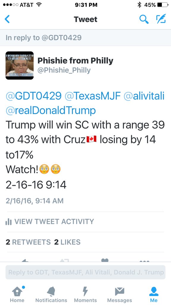 @realDonaldTrump Lets go South Carolina..we want numbers like 40% to shut the media up and to shut cruz down#vote4trump#cruz4primeminister - 1 more reply