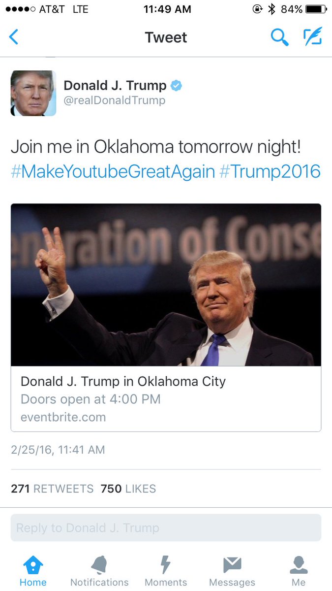 @realDonaldTrump does no one realize he just said#MakeYoutubeGreatAgain and not#MakeAmericaGreatAgain ??