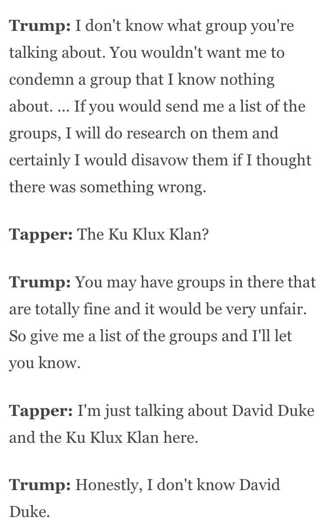 @AndreaOfee3@realDonaldTrump I watched@jaketapper myself. I heard what I heard! He had 3 chances and wouldn't denounce#NeverTrump -